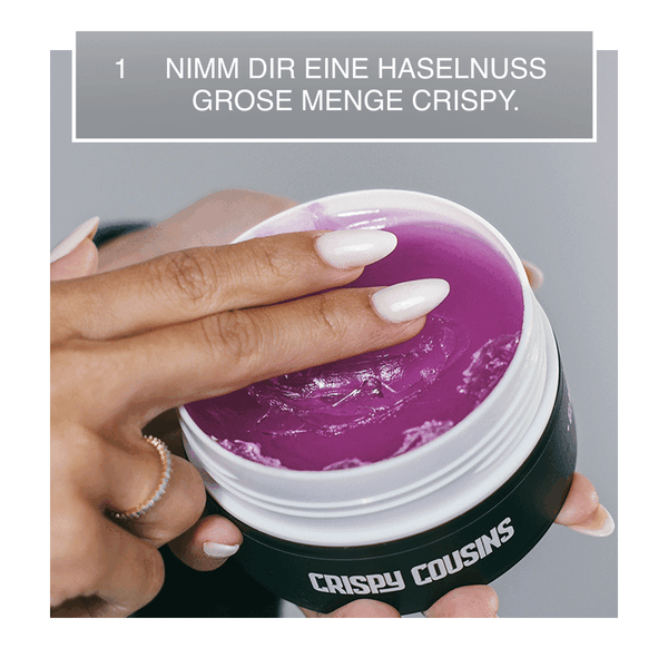 Haselnussgroße Menge mit dem Finger entnehmen, in den Handflächen verreiben und gleichmäßig im Haar verteilen – fertig ist der Look.